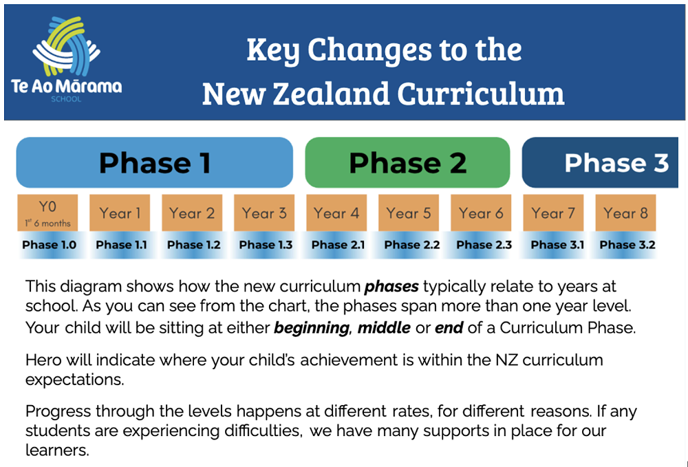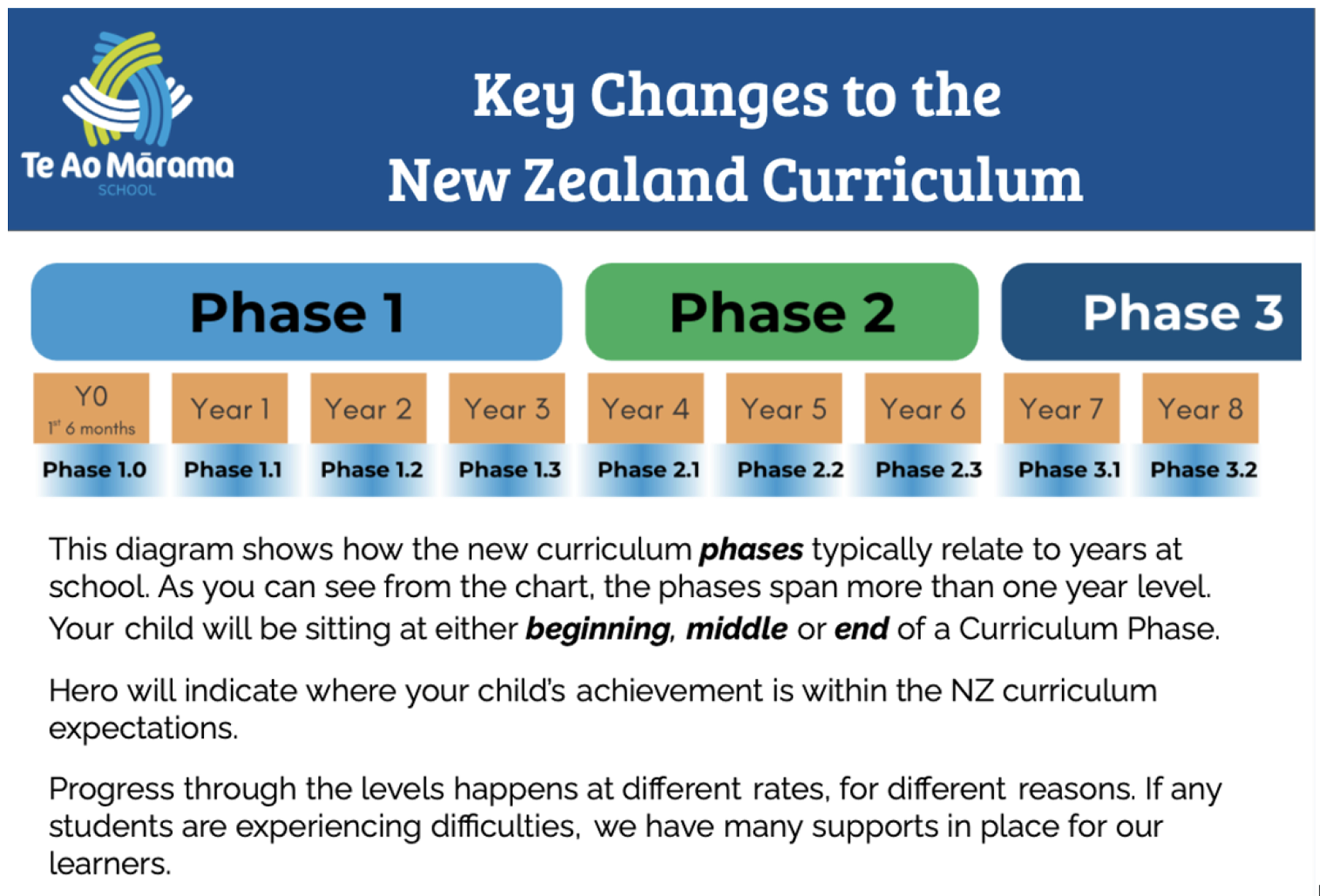 The NZ Curriculum has moved towards a progression model where curriculum achievement levels have been replaced with ‘phases of learning’. Each phase has a focus on the student and their social, emotional, and cognitive learning.