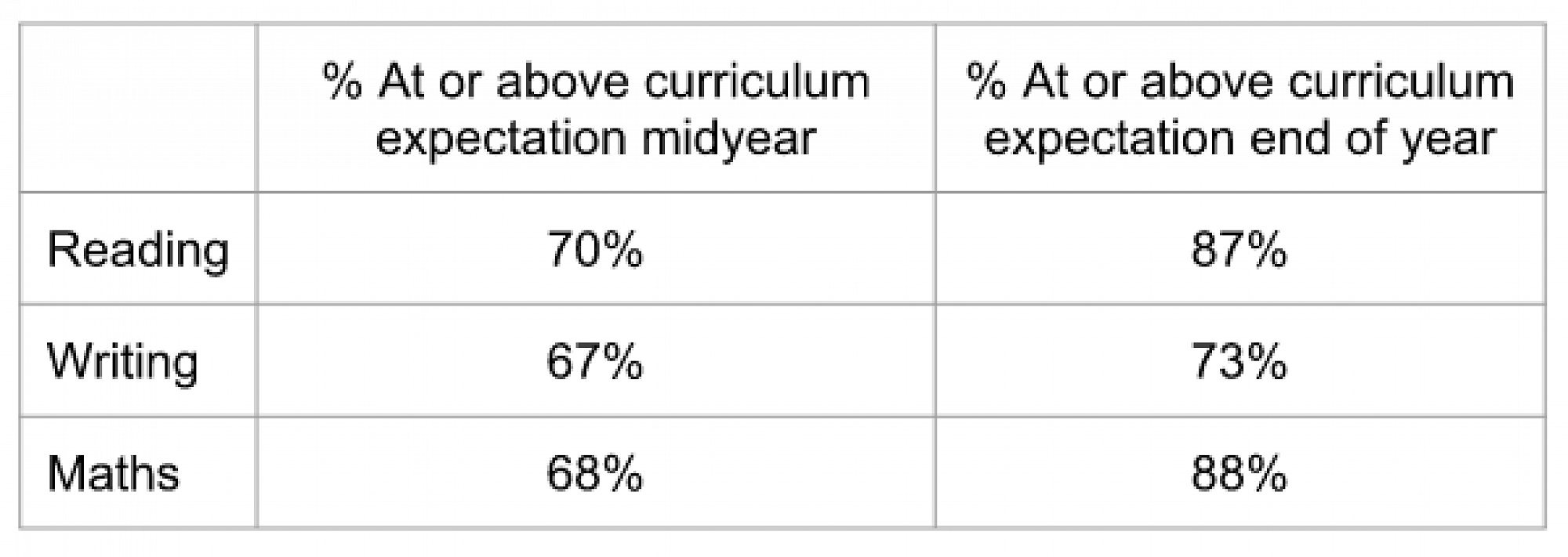 Below is an initial overview of the gains our students have made in the core areas of reading, writing and maths.