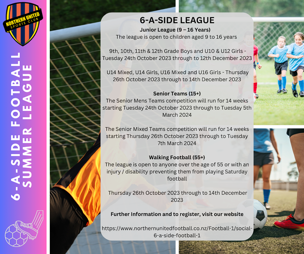 For more information, please visit: https://www.northernunitedfootball.co.nz/Football-1/social-6-a-side-football-1