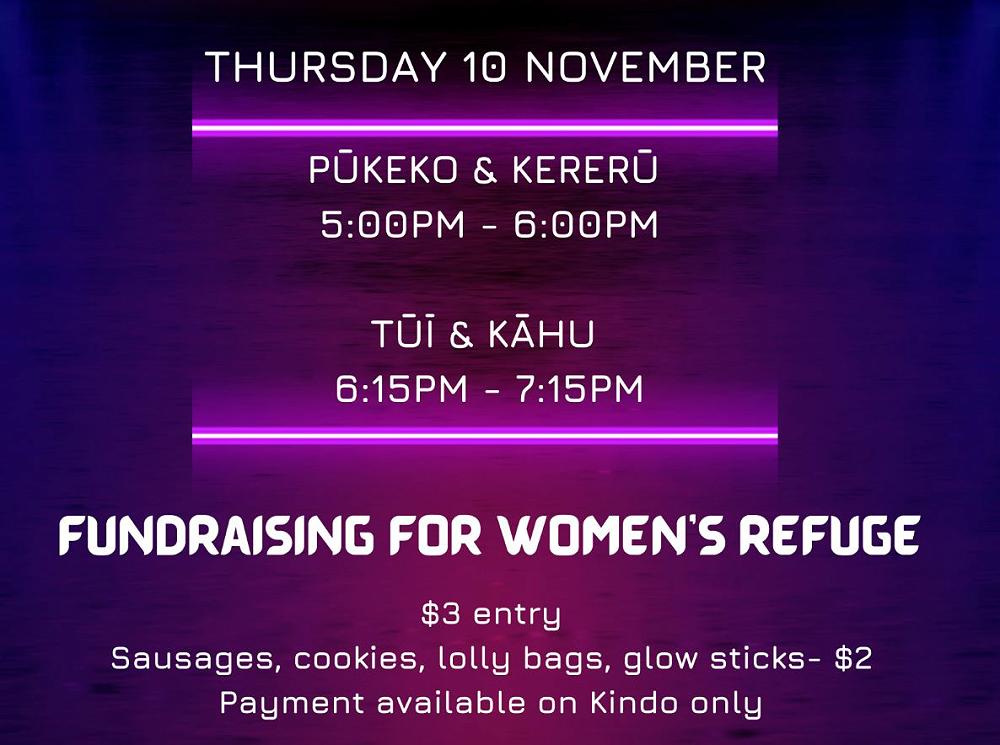 $3.00 entry, plus optional extras $2.00 each (glow sticks & food). All proceeds to Waikato Womens' Refuge ❤