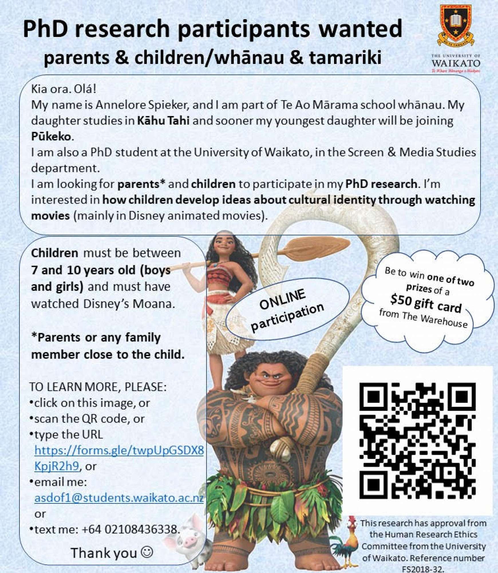 My daughter studies in Kāhu Tahi and my youngest daughter will soon be joining Pūkeko. I am also a PhD student at the University of Waikato, in the Screen & Media Studies department. I am looking for parents* and children to participate in my PhD research. I’m interested in how children develop ideas about cultural identity through watching movies (mainly in Disney animated movies).