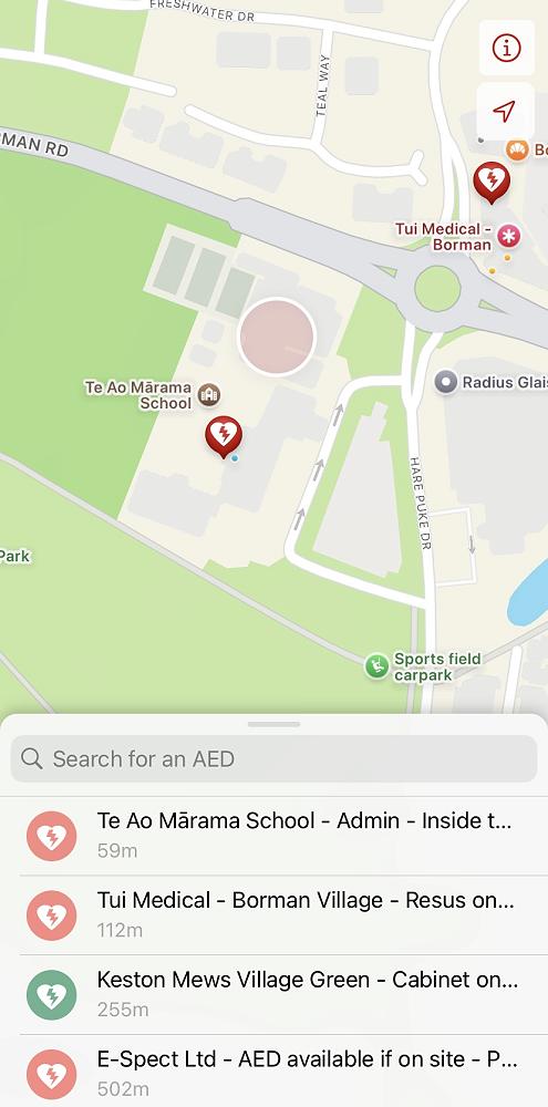 We strongly recommend downloading the AED Locations app to your mobile device. AED Locations quickly locates the nearest AED to your current location in an emergency (https://aedlocations.co.nz/).