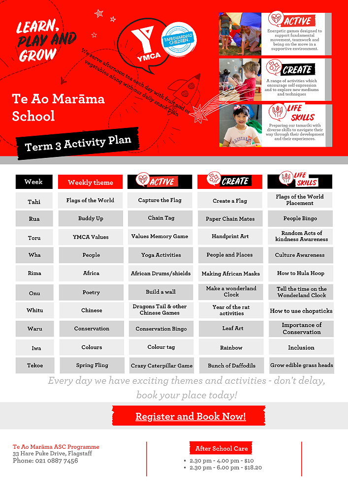 Te Ao Mārama School has an After School Care programme available which is run by YMCA.