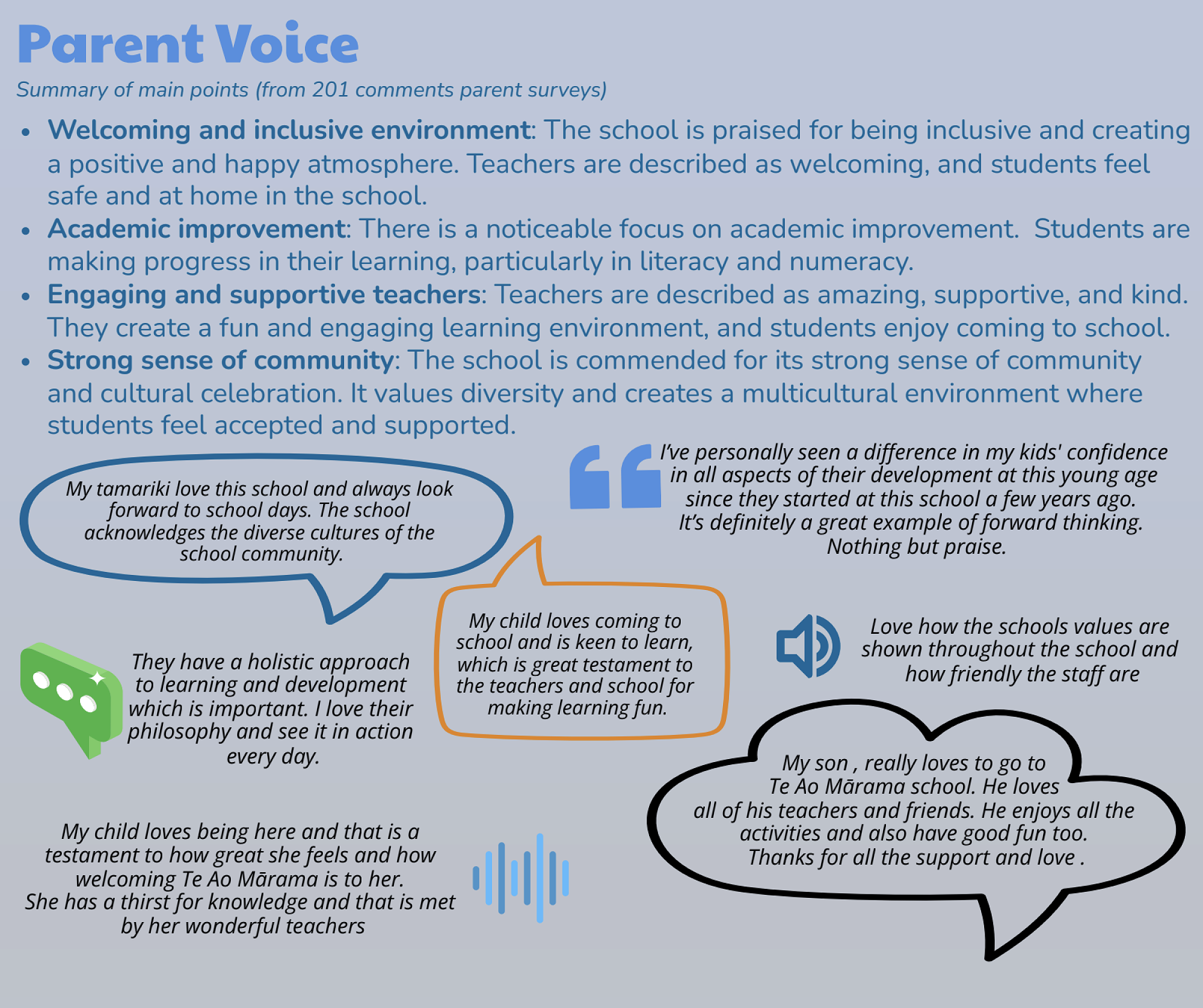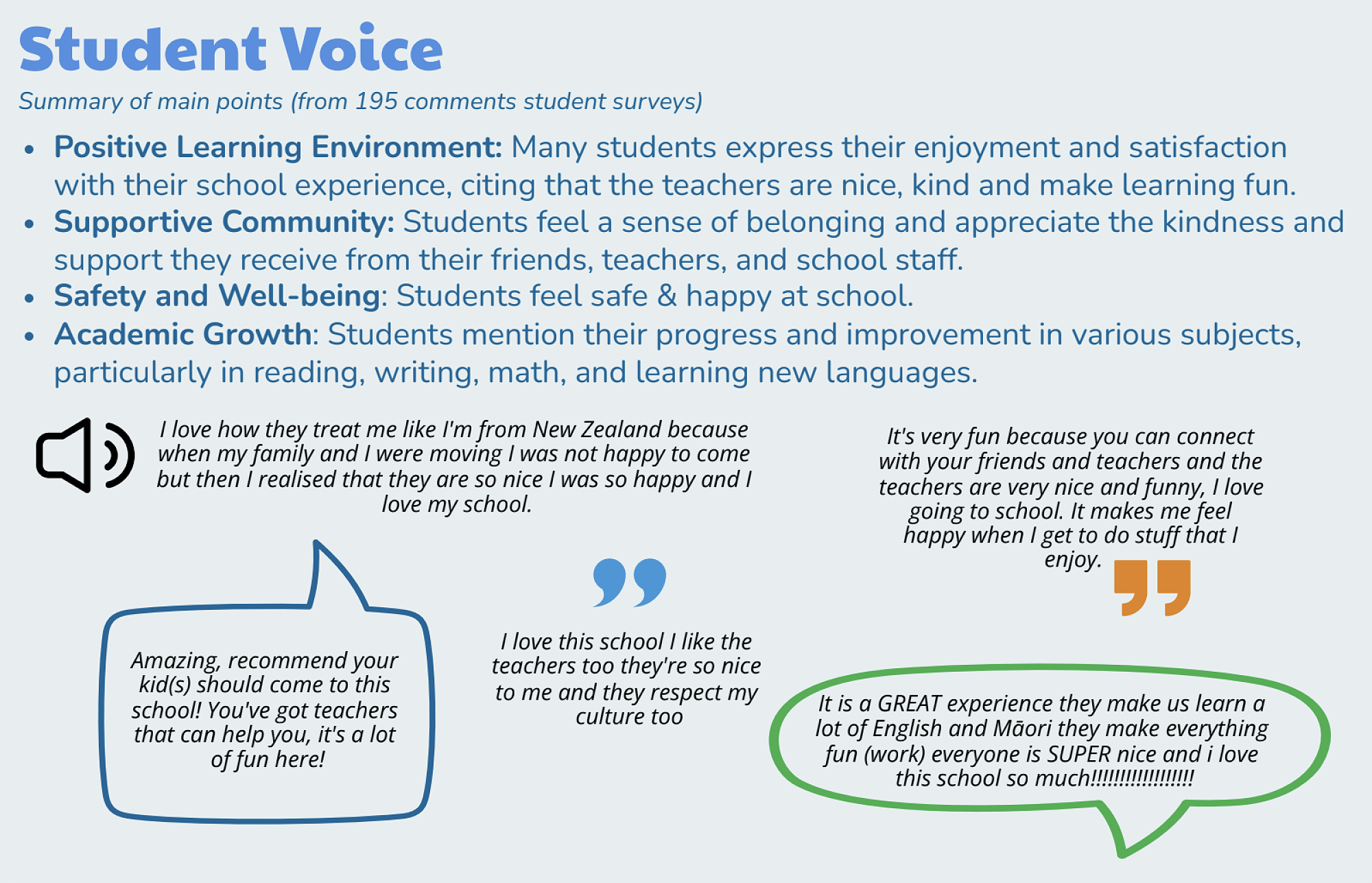 The evidence gathered provides direct insight into how our approach is experienced by learners, whānau, and teachers across our school.