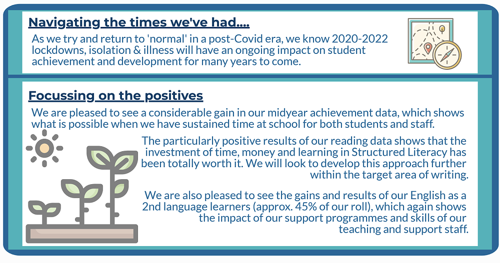 One of these touch points is our student achievement data, which, as you can see from the graphics below which represent a mid-year summary, provide some pleasing results and positive trends post-covid.