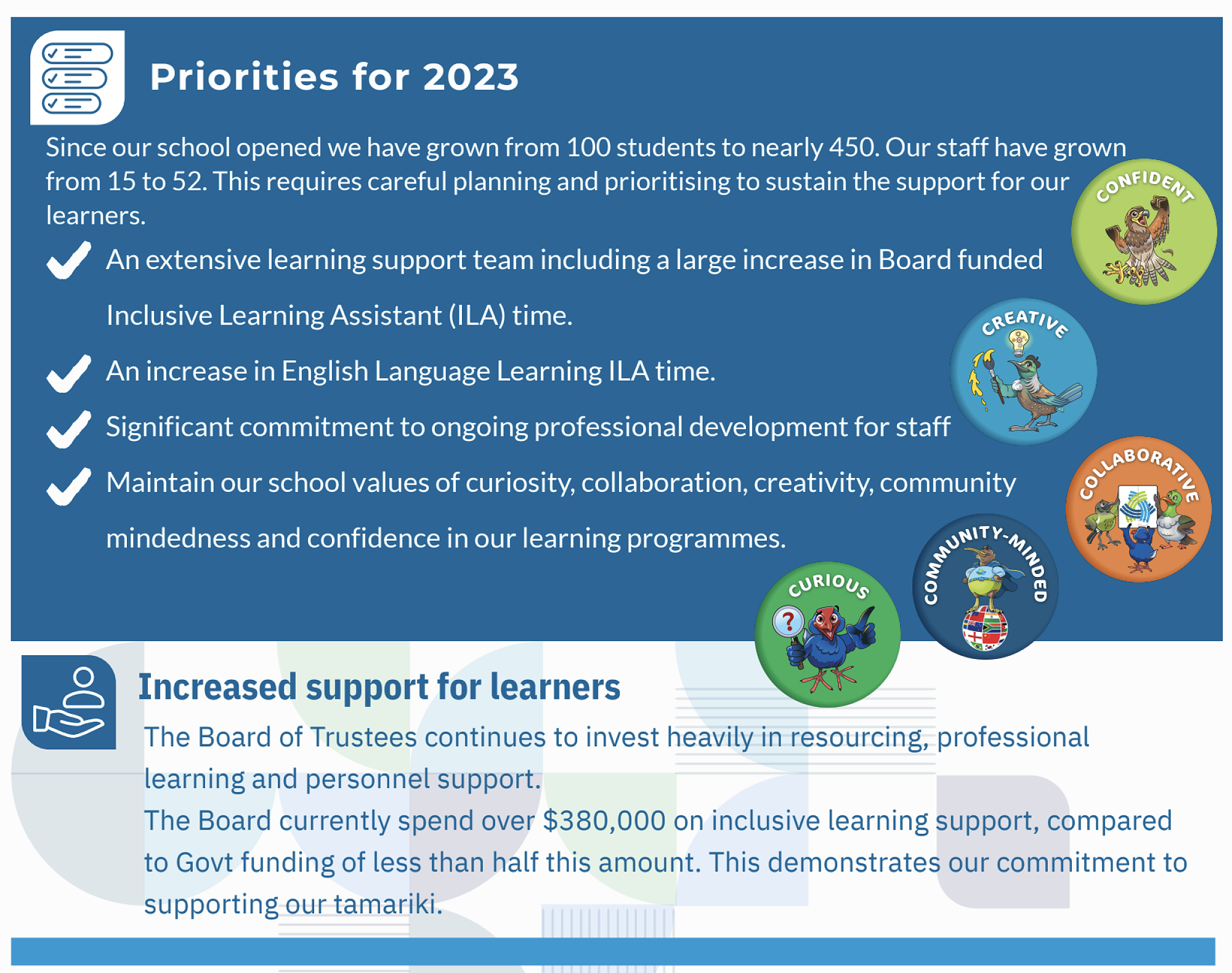 As a School Board we have several touch points throughout the year which give us an indication of 'how our school is going'. Our role is to provide a governance layer which means we focus on what the school is achieving at the highest level - not on the day to day curriculum delivery and associated roles undertaken by our expert kaiako.