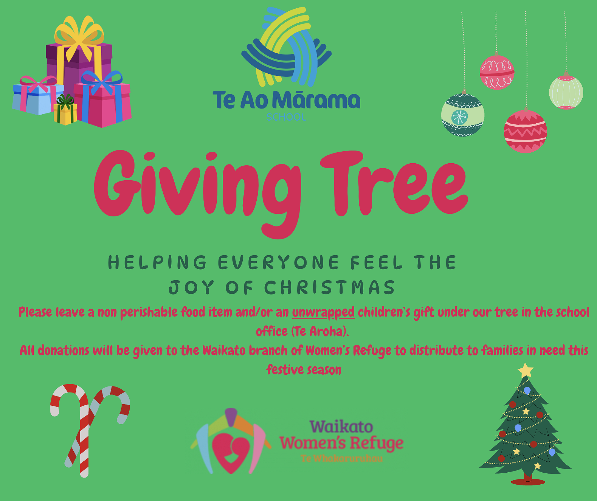 You can place your donations under the Giving Tree in Te Aroha (office) up until the last day of term.