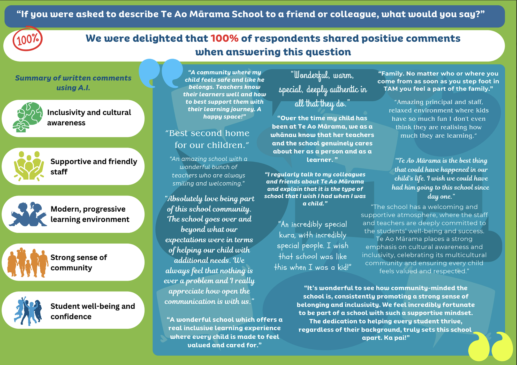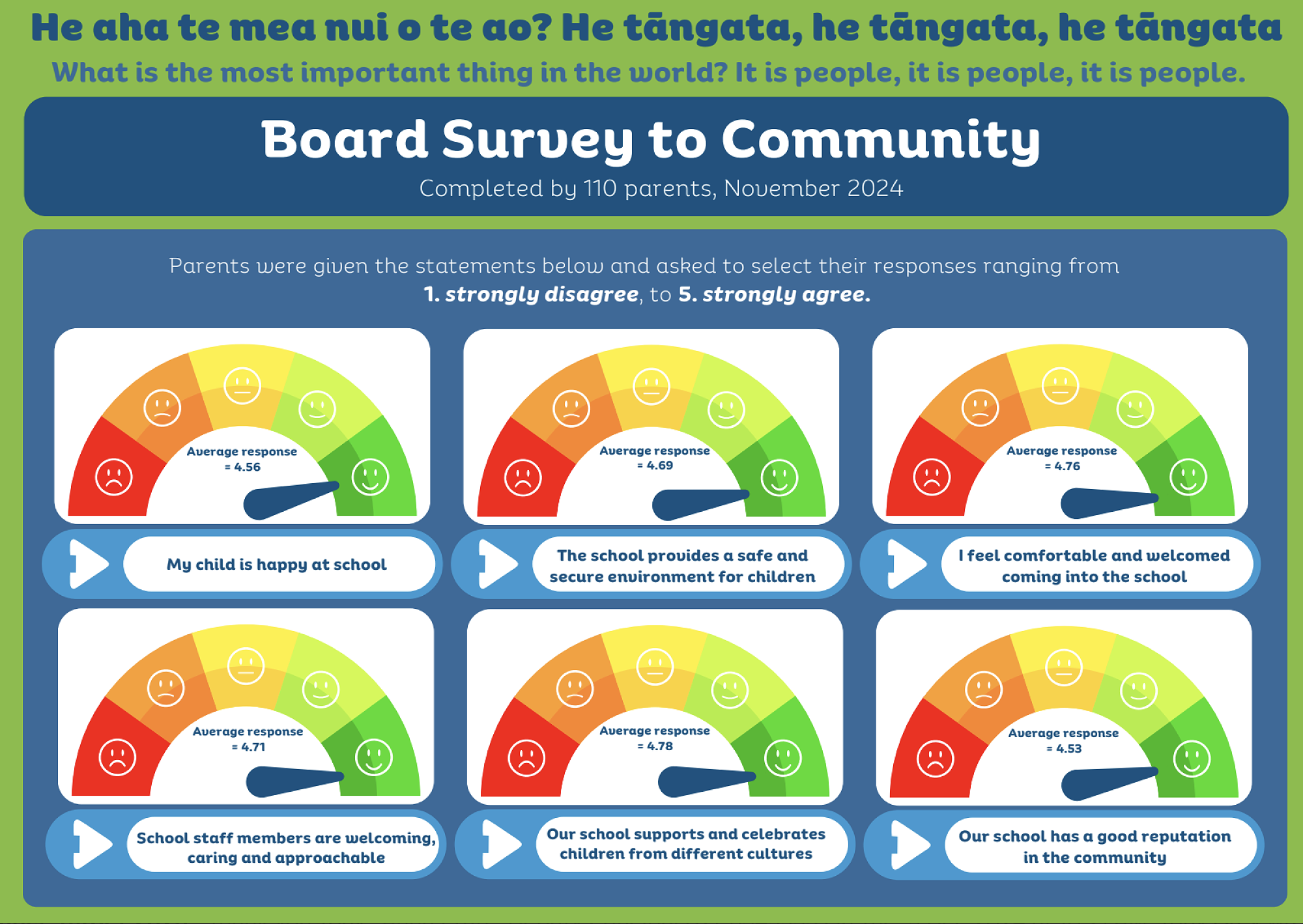 The survey highlights how fortunate we are to be part of such an amazing and innovative school. At the same time, we remain deeply committed to ongoing improvement. As parents, we can trust that these improvements will be made with the best interests of the school, the wider community, and, most importantly, our tamariki at heart.