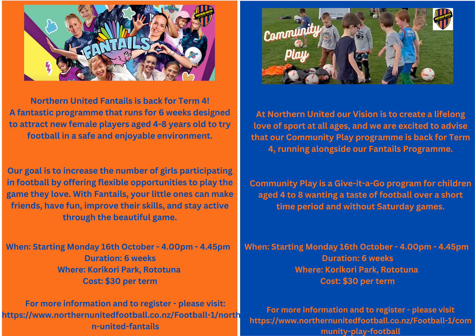 For more information & to register, please visit www.northernunitedfootball.co.nz/Football-1/northern-united-fantails or www.northernunitedfootball.co.nz/Football-1/community-play-football