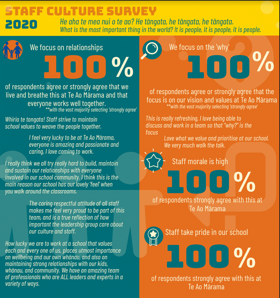 This term we surveyed our staff here at Te Ao Mārama, and I am delighted to share the results of that survey with our parent community.
