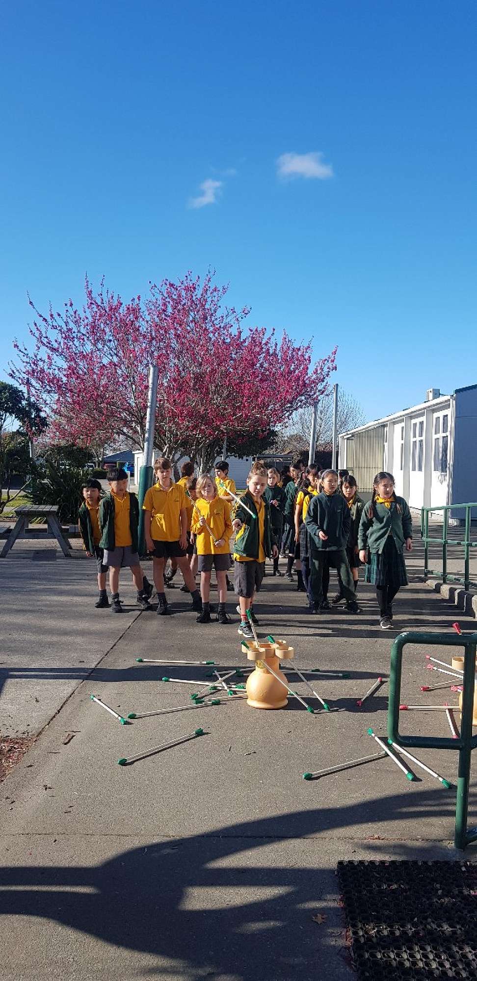 The students also played a game called toho where you thought of the area and you would throw your (blunt) arrow to the hole. You got 1 point for the small one. The big one was worth 3 points and the girls threw their arrows in the red container and the boys threw their arrows in the green container.