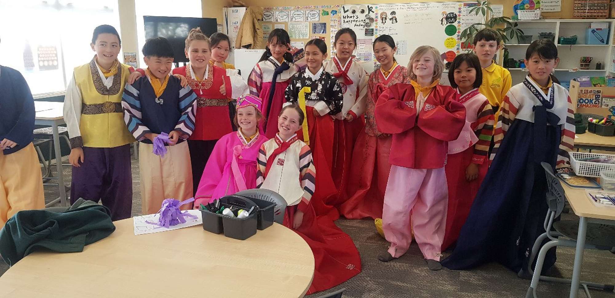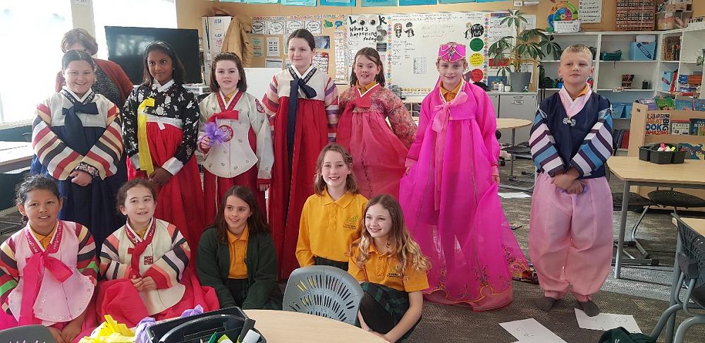 They also tried on hanbok. It's a type of Korean outfit. There were many colours like red, black, yellow and so much more. Georgia and Ava-Grace found this very interesting. Everyone had fun dressing up. We are thankful for Jenny coming to Roydvale for the Korean festival. We all had such a good time at the Korean festival.