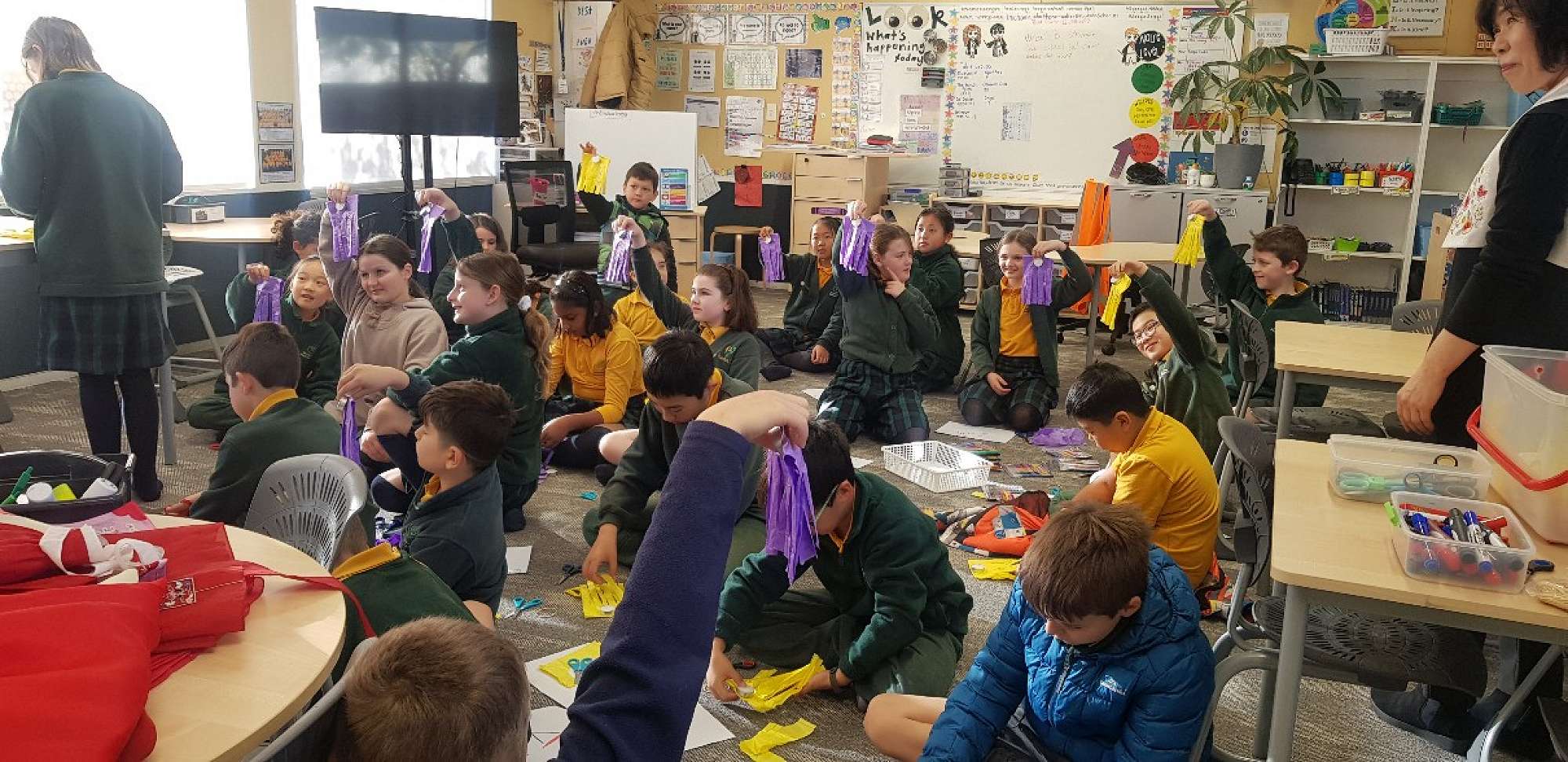 The students also made Jegi. They had to grab a rubbish bag. The colours were yellow and purple. Then they folded it and got a candle and then put it in the middle of the rubbish bag. Next they cut 8 lines but they had to make sure they didn’t cut it too far. When they finished they would unfold it and put the candle in the middle again. Lastly they would wrap it up and tie it up with a rubber band. The children found this very fun but the best part was when they got to kick the jegi around the place. Dylan and Charlie said they really enjoyed it.