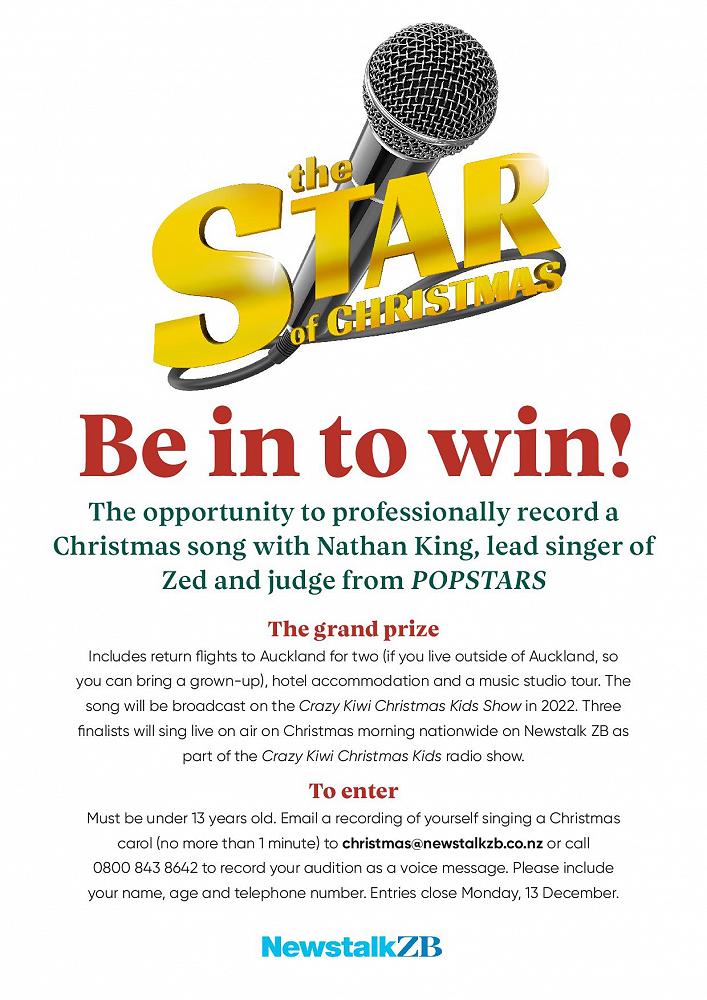 This Christmas morning on Newstalk ZB – it’s The Star of Christmas singing competition… on The Crazy Kiwi Christmas Kids Show! The grand prize? The opportunity to professionally record any Christmas song with Nathan King, judge from POPSTARS. You’ll be treated like a star – with return flights for two to Auckland (if you’re out of Auckland), hotel accommodation, and a music studio tour. If you can sing, and are under 13, email your audition singing a Christmas song to christmas@newstalkzb.co.nz or call 0800 843 864 before 13th December. Then tune in to Newstalk ZB on Christmas morning from 6 am to see if you’ve won!
