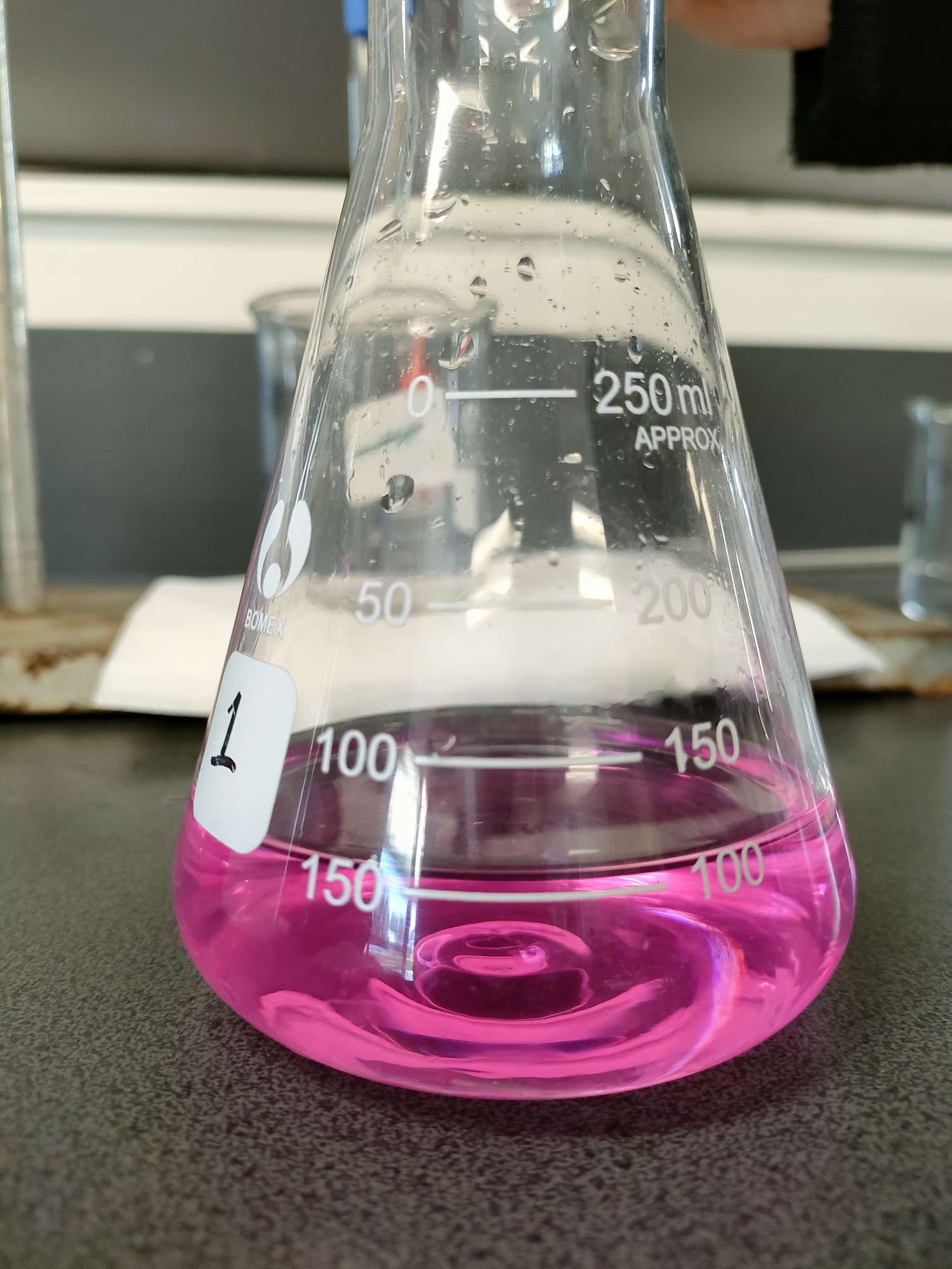 Since the start of the term in Level 2 Chemistry, we have been working on titrations, which is how we find out the concentration of an unknown substance. As you can see in the photo it is a kind of magenta colour.