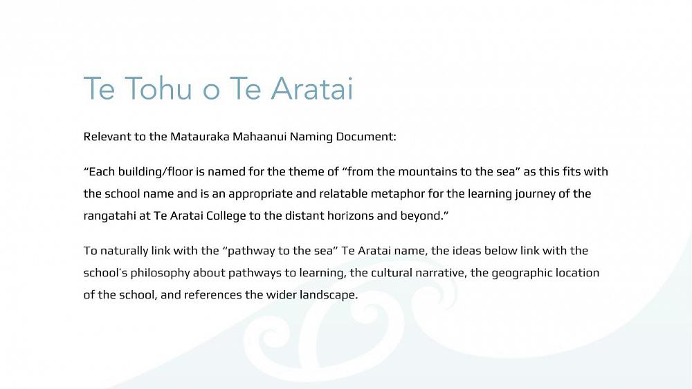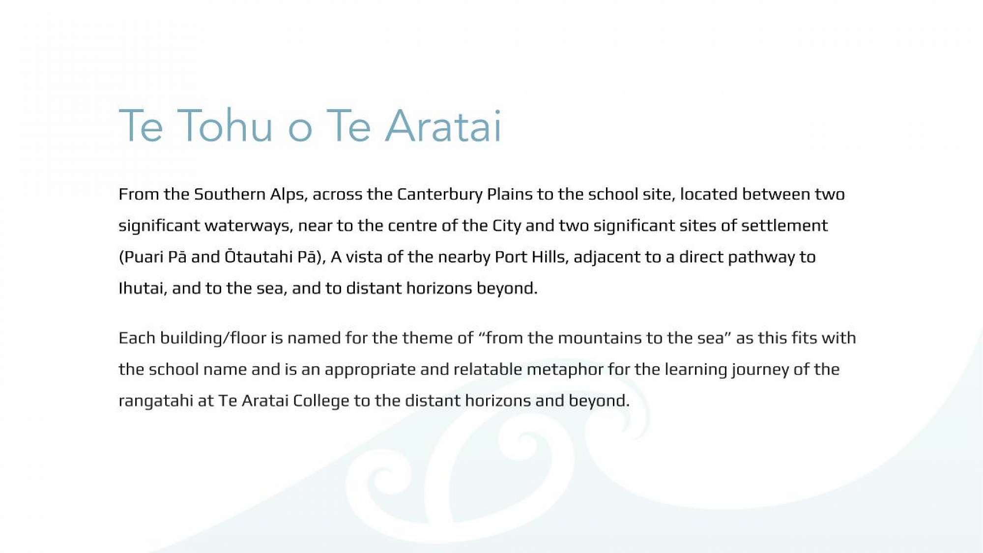 The following 11 slides, both in the link below and then in the text, explain its meaning and deep connection to our community. We are very grateful to the designer, Morgan Mathews-Hale, both for her deep understanding of Te Aratai College and her expertise.