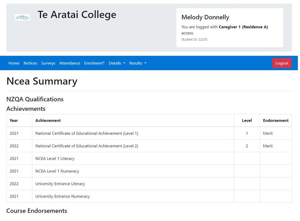 Once you have logged in, the homepage goes straight to attendance which is live and you can scroll through the previous weeks. If you then click "Results" you will have access to all NCEA results for your learner, and their school reports etc.