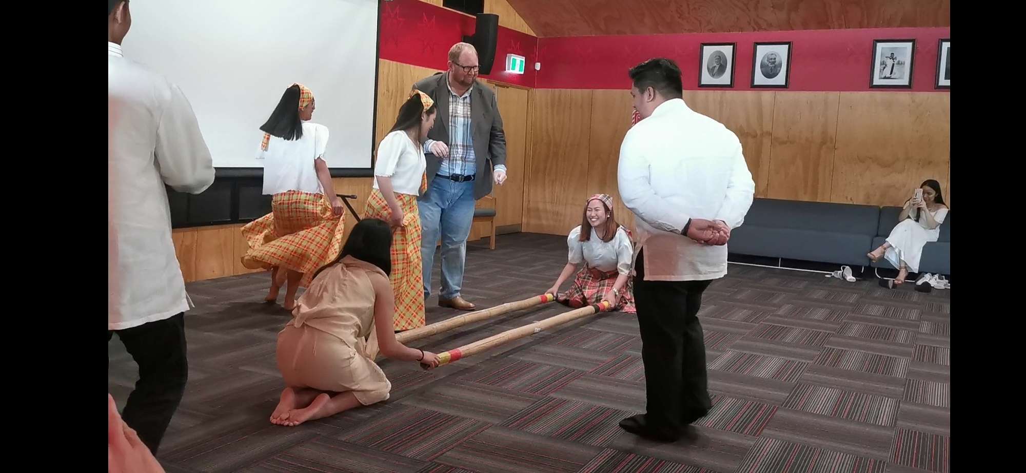 Our students performed the traditional Filipino dance 'Tinikling' (bamboo dance) where, to the delight of everyone present, even the newly-elected mayor of Waimakariri District, Dan Gordon gave it a try.