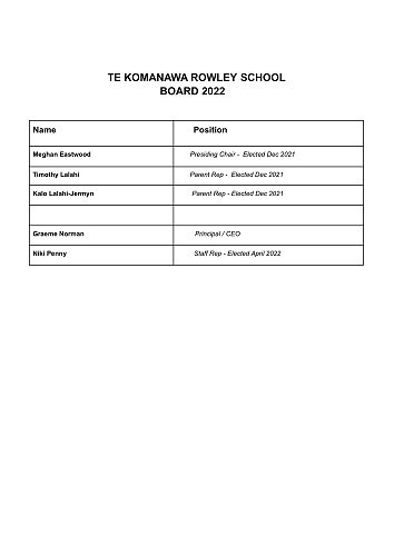 Below are the names and positions of our Te Kōmanawa Rowley School Board members.