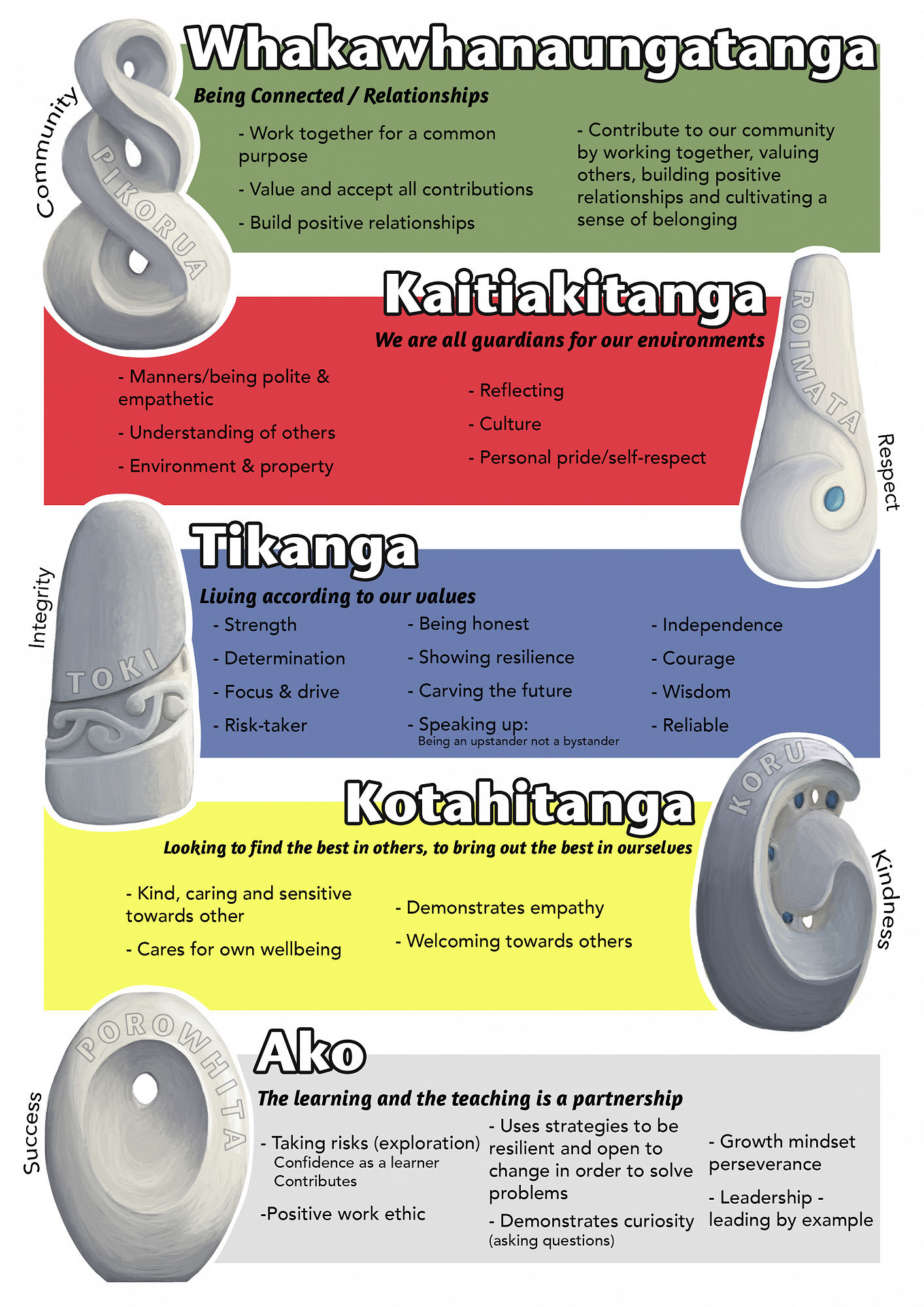 Our school values are Whakawhanaungatanga (Community), Ako (Success), Kotahitanga (Kindness), Kaitiakitanga (Respect) and Tikanga (Integrity). At Te Koromiko Swannanoa School, we encourage all learners to be actively involved in our community, to always be the best they can be through following our five taonga (treasures).