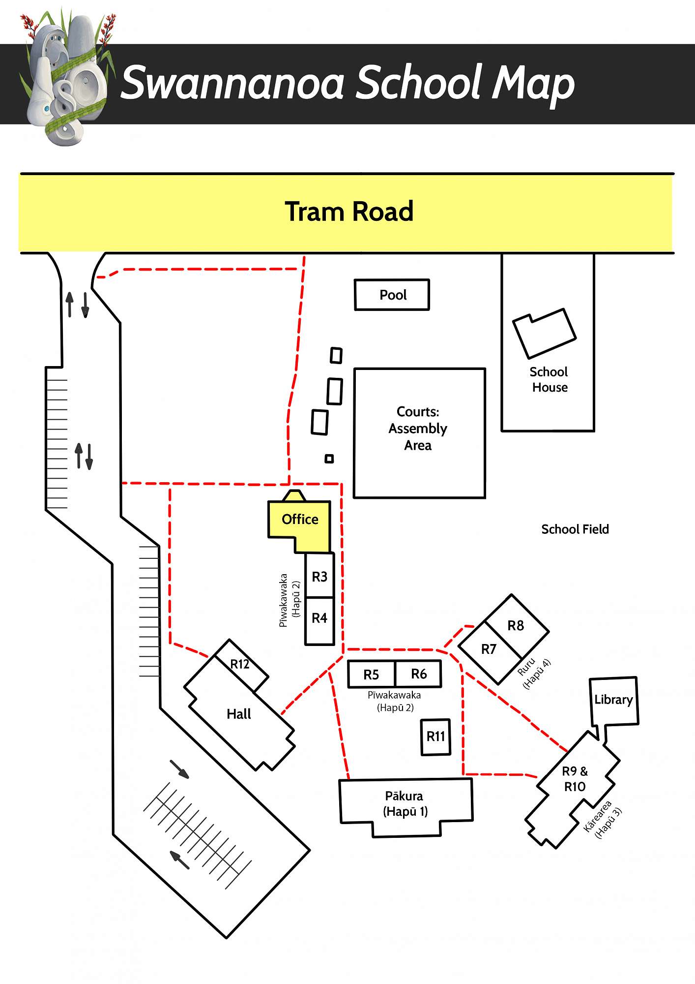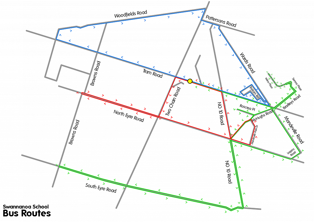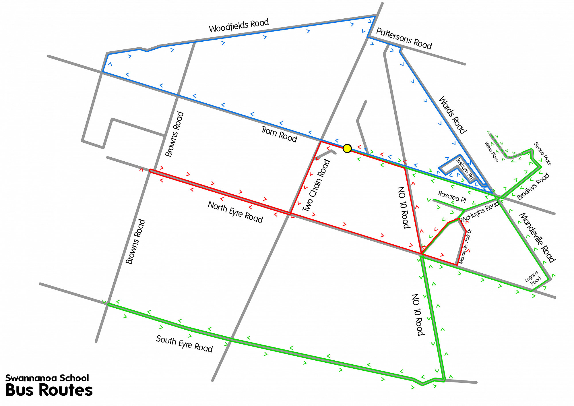 Three buses currently operate at Te Koromiko Swannanoa School. If you live at least 3.2km away from the school, your children are eligible to catch the bus. There are three bus routes, outlined on the map below: