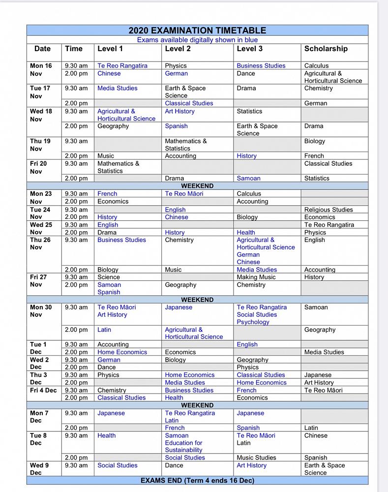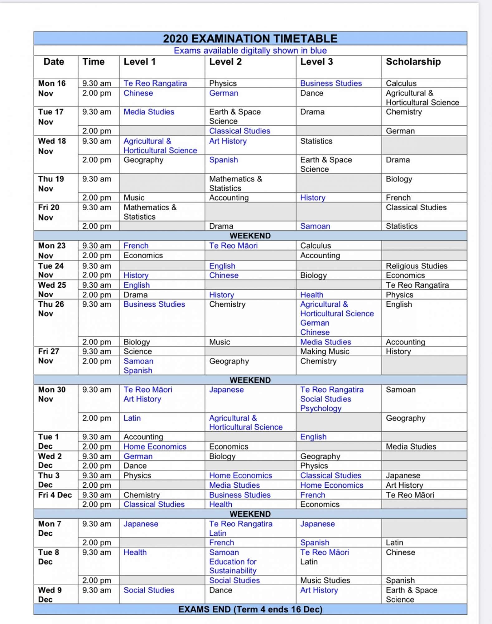 Attatched is the NCEA examination timetable for 2020. Exams will run from Monday 16th November to Wednesday 9th of December.