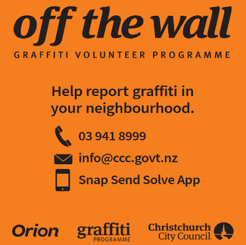 As well as joining the existing programme, people can now opt into "micro‑volunteering" to report graffiti – to become a "friend" with no formal volunteering requirements and, by supplying an email address, go in a monthly voucher prize draw for each report made. To read more and sign up: https://ccc.govt.nz/services/graffiti/volunteers/.