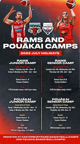 The Canterbury Rams & Mainland Pouākai offer Junior & Senior Basketball Camps boys & girls camps in the July holidays. The Camps are for School Years 5 – 13. The camps will be coaching by Canterbury Rams and Mainland Pouākai players. Sign up for the camps today.