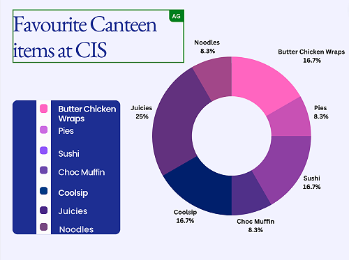 We asked some students from Rooms 10, 11 and 5 what their favourite item at the canteen is. We did the maths and put our information in the pie chart below. The information shows that the top 3 canteen items are Juicies, Butter Chicken Wraps, and Muffins.