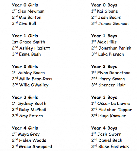 A huge big thank you to all the staff and parent helpers for marshalling the event, we could not have done it without you. It was great to see a large number of parents at the event supporting their children too. Congratulations to the following children (see attached photo).