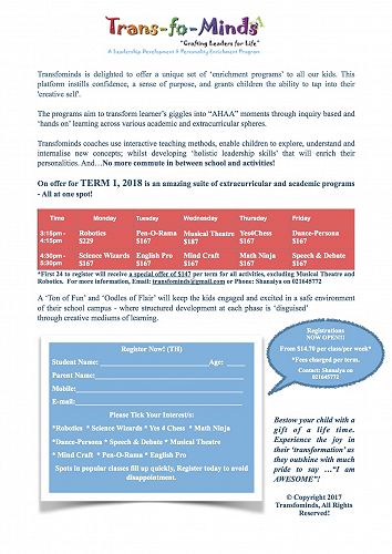 "Trans-fo-minds is delighted to offer a unique set of ‘enrichment programs’ to all our kids. This platform instills confidence, a sense of purpose, and grants children the ability to tap into their 'creative self'. The programs aim to transform learner’s giggles into “AHAA” moments through inquiry based and ‘hands on’ learning across various academic and extracurricular spheres. "