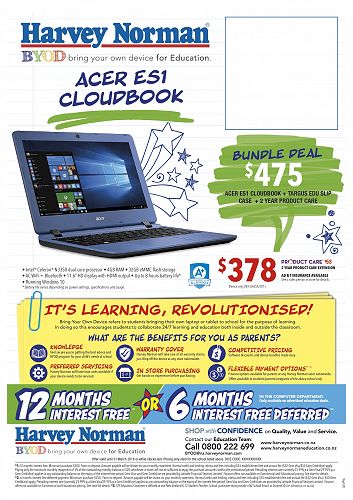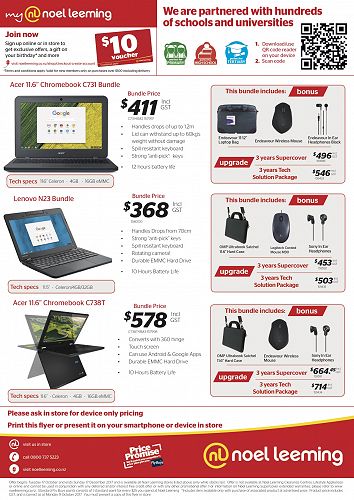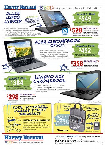 All devices listed on the following flyers meet our criteria and will connect to our network. Some of the quotes include insurance options, and free tech support to set up devices. All devices will need to have a case, so bundle options can often save you money as well. If price is your primary concern, then the cheapest device listed (that will be more than suitable) is the N22 Lenovo Chromebook from Harvey Norman at $298 ($384 bundle deal).