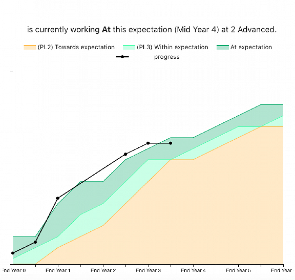 A new feature that our HERO software offers is the progress chart. This shows a child's progress over time (two data points a year) with the backdrop of the school expectations. If you are looking for "how your child is doing" or "how they are going compared to last year" this is where to look.
