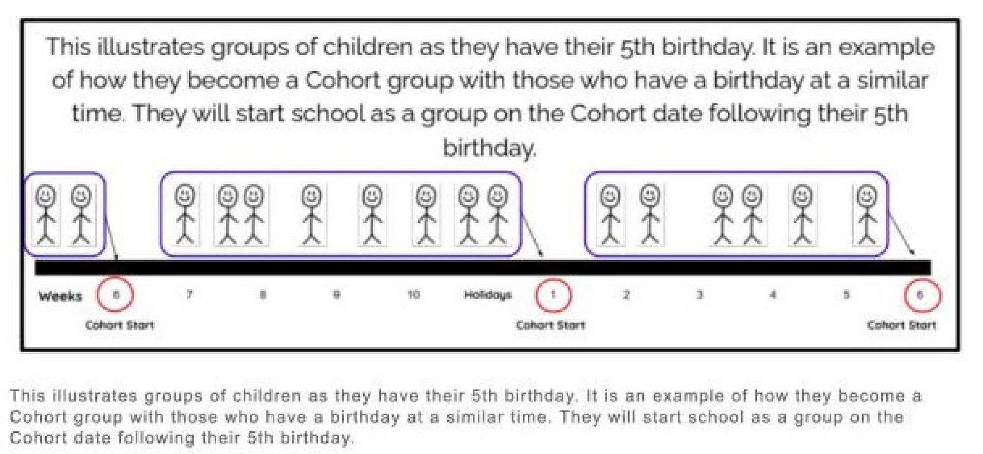 Cohort entry is when new entrants start school in groups throughout the year rather than on their fifth birthday. After a child turns 5, their school start date is the first day of the next cohort entry date
