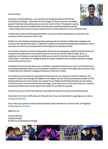 Please find attached a message from St Thomas of Canterbury Acting Principal, Hamish Barclay, regarding the recent confirmation of the school's year level change and maximum roll increase.