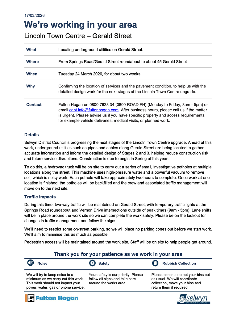 Please see attached for a start work notice about upcoming potholing works that will be carried out at night on Gerald Street and a portion of Springs Rd and Ellesmere Junction Road. This work is due to start on 12 April 2026 and take approximately one week to complete.
