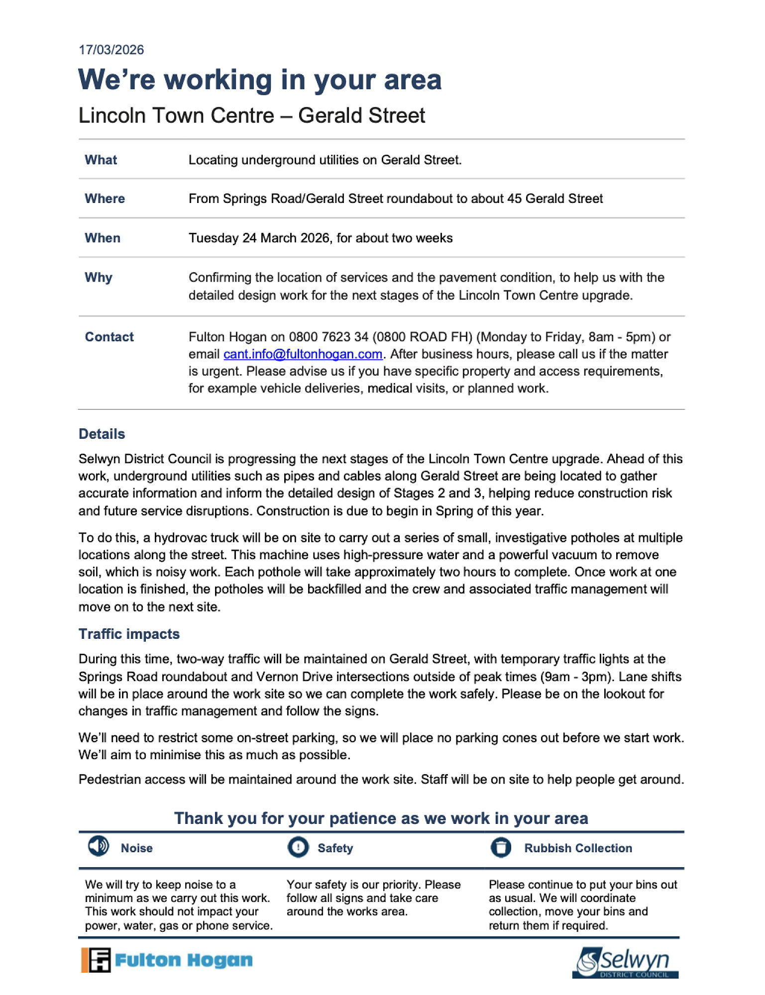 Properties and businesses in the nearby area will receive a start work notice. If you have specific access needs, such as deliveries or medical visits, please contact Fulton Hogan on 0800 762 334 or cant.info@fultonhogan.com.