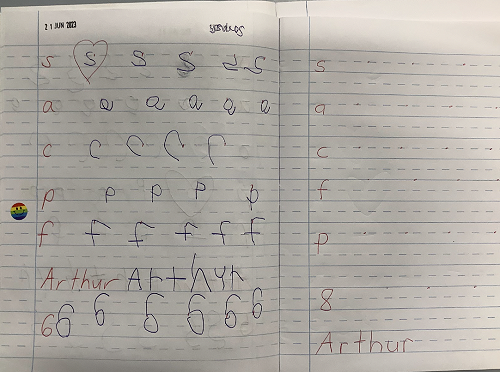 We are so proud of ourselves because our handwriting is getting better and better. We don’t trace over a highlighter anymore because we know how to form the letter. When we form a ‘p’ - we say to ourselves “hanging stick and close the gate”. When we form an ‘f’ we say “feeler and twig”. We also know the sounds that these letters make. In our handwriting we get to use a blue pen, just like a big kid. We also know that it is really important to hold our pen nice and tight in a pinch grip and to sit up straight with our legs under the tables. When we practise our handwriting it activates a part of our brain that makes us super creative learners.