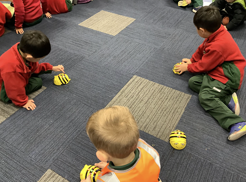 This tells the BeeBot what we want it to do. To do this we draw arrows on whiteboards and we follow the instructions. We can make the Beebot go across to the other side of the room, turn itself around and then come back to us! Our next task is to create obstacles for them to go around.