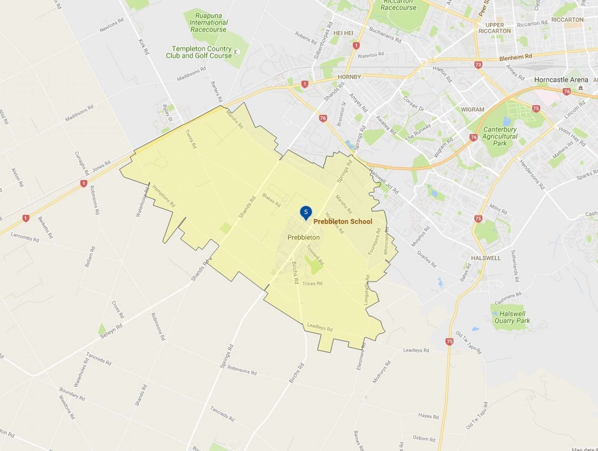 The boundary for enrolment at Prebbleton School is the block formed by: Halswell Junction Road (south side only) between Knights Stream and Springs Road; Springs Road from Halswell Junction Road to Marshs Road; Marshs Road to Main South Road; Main South Road to Hamptons Road; Hamptons Road to Birchs Road; Birchs Road to Leadleys Road; Leadleys Road to Ellesmere Road; Ellesmere Road to Tosswill Road; Tosswill Road to Longstaffs Road; Longstaffs Road to Whincops Road; Whincops Road to Knights Stream on the intersection with Marshs and Quaifes Road; Follow Knights Stream to Halswell Junction Road.