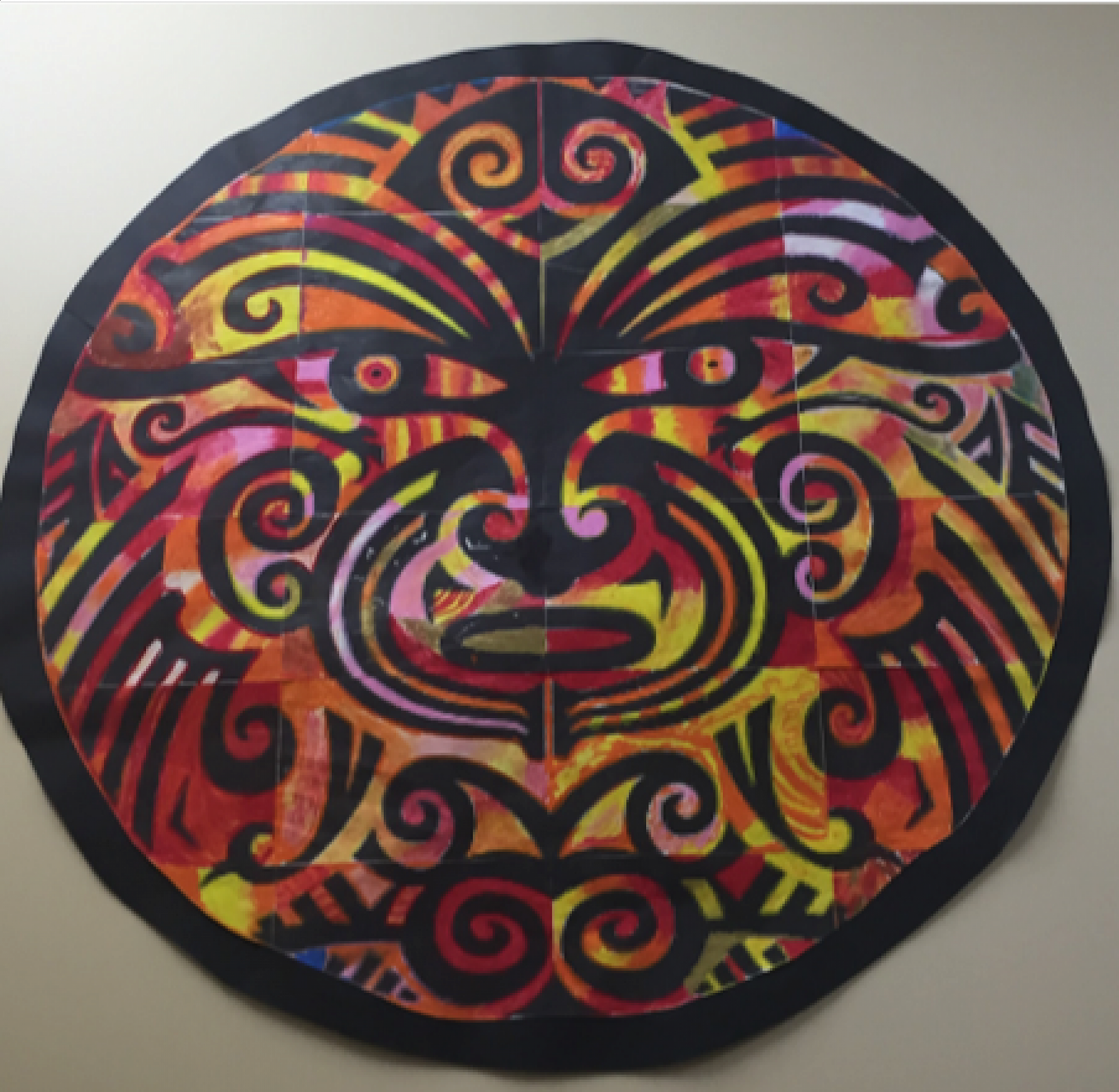 Here is an example of a collaborative artwork for the school office area. We learnt about Maui and the Sun then worked together to colour this design using pastels.