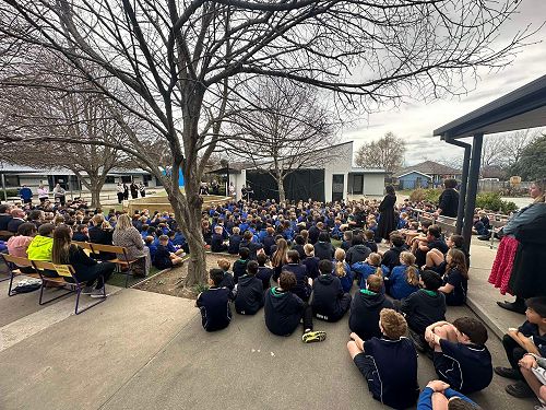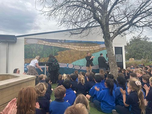 Last Friday afternoon, our kura hosted a special unveiling ceremony to celebrate our completed artwork and the journey we had in it’s creation. In attendance we had Liz Hill-Taiaroa & Tamra Nutira from Ngāi Tahu, MP for Selwyn, Nicola Grigg, Dulux sponsors, our artist, Justine and our amazing Taumata Kuri Prebbleton whānau and ākonga.