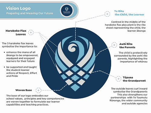 The logo design is based on the inspiration of the Harakeke plant and weaving to create a visual representation of the vision of 'Preparing and Weaving our Future'.