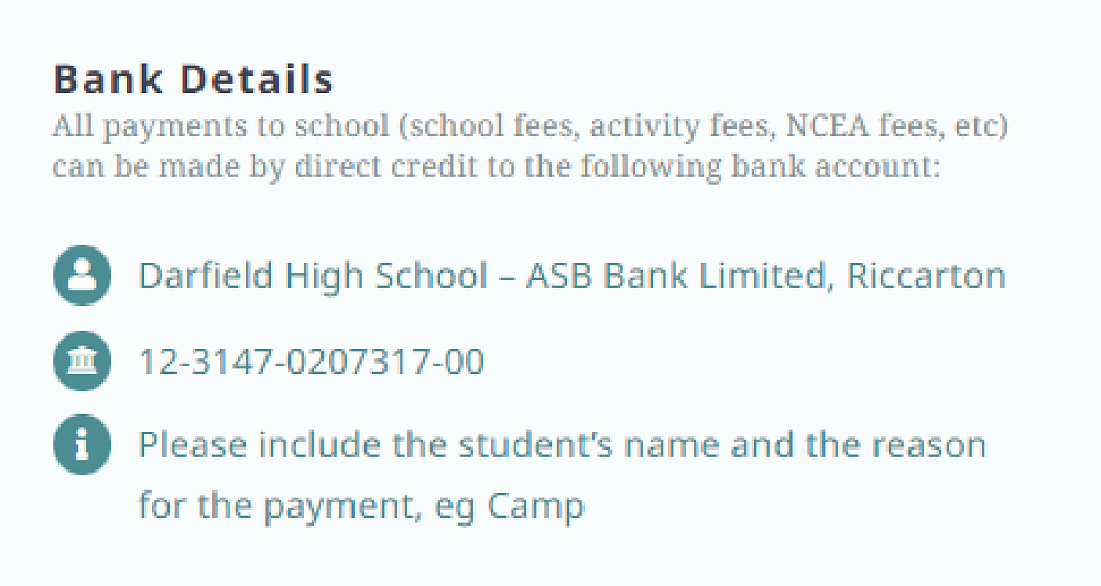 The bank details are attached for your reference but can be found on our website at: https://darfield.school.nz/donations-fees