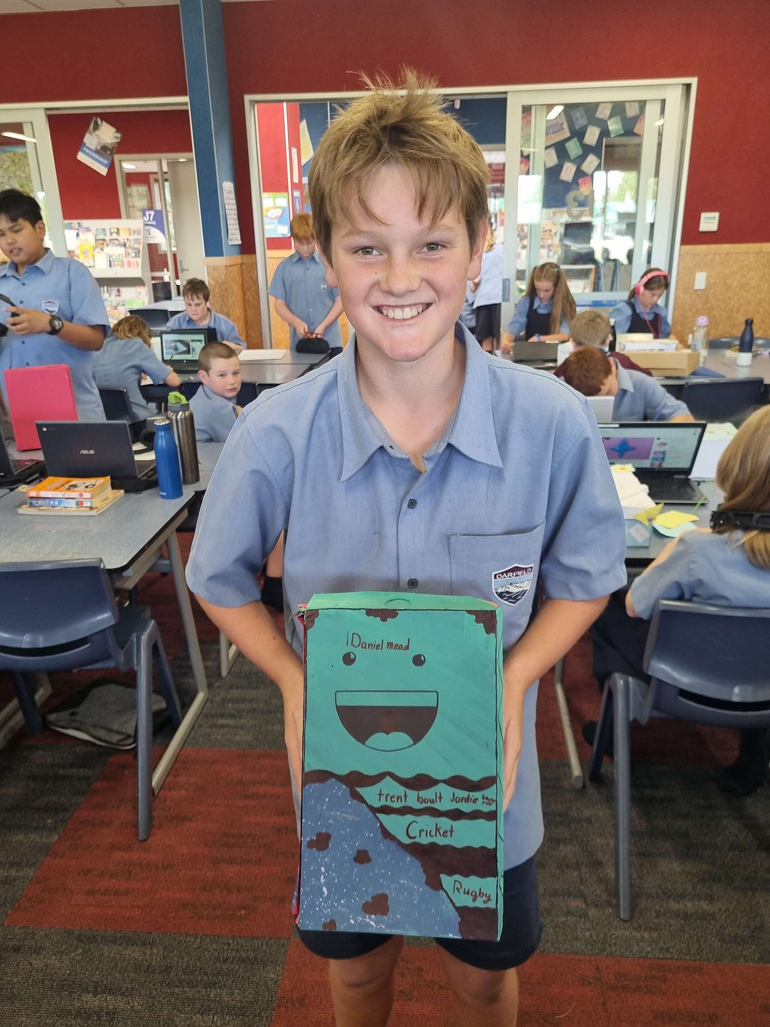 Each Year 7 were asked to bring photos, pictures or other treasures that they would like to put onto their Waka huia. Here are Anzel Nel and Daniel Mead with their Waka Huia.