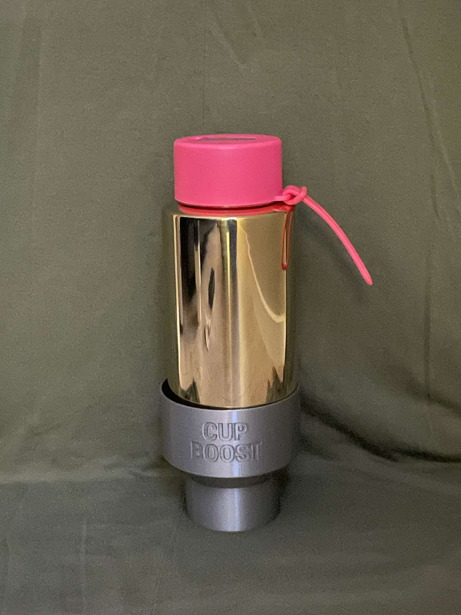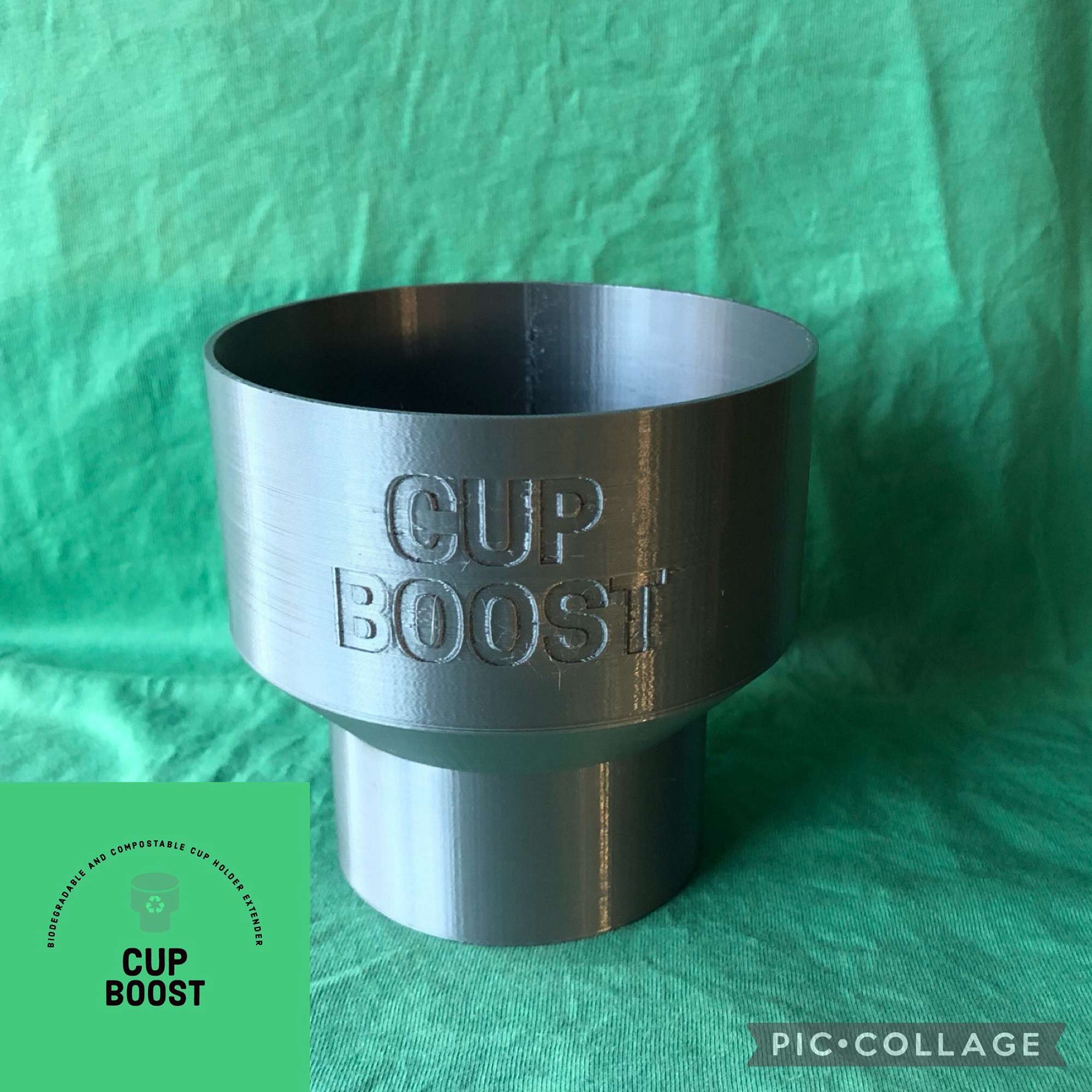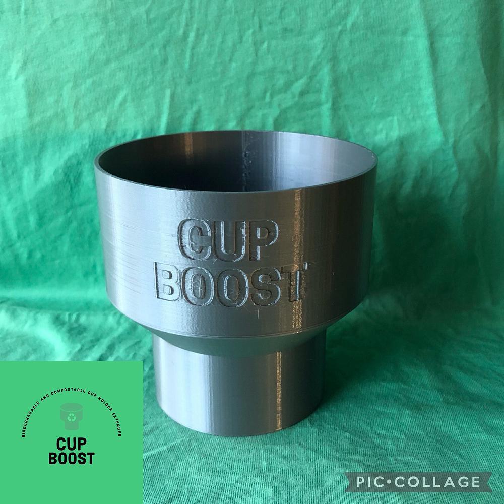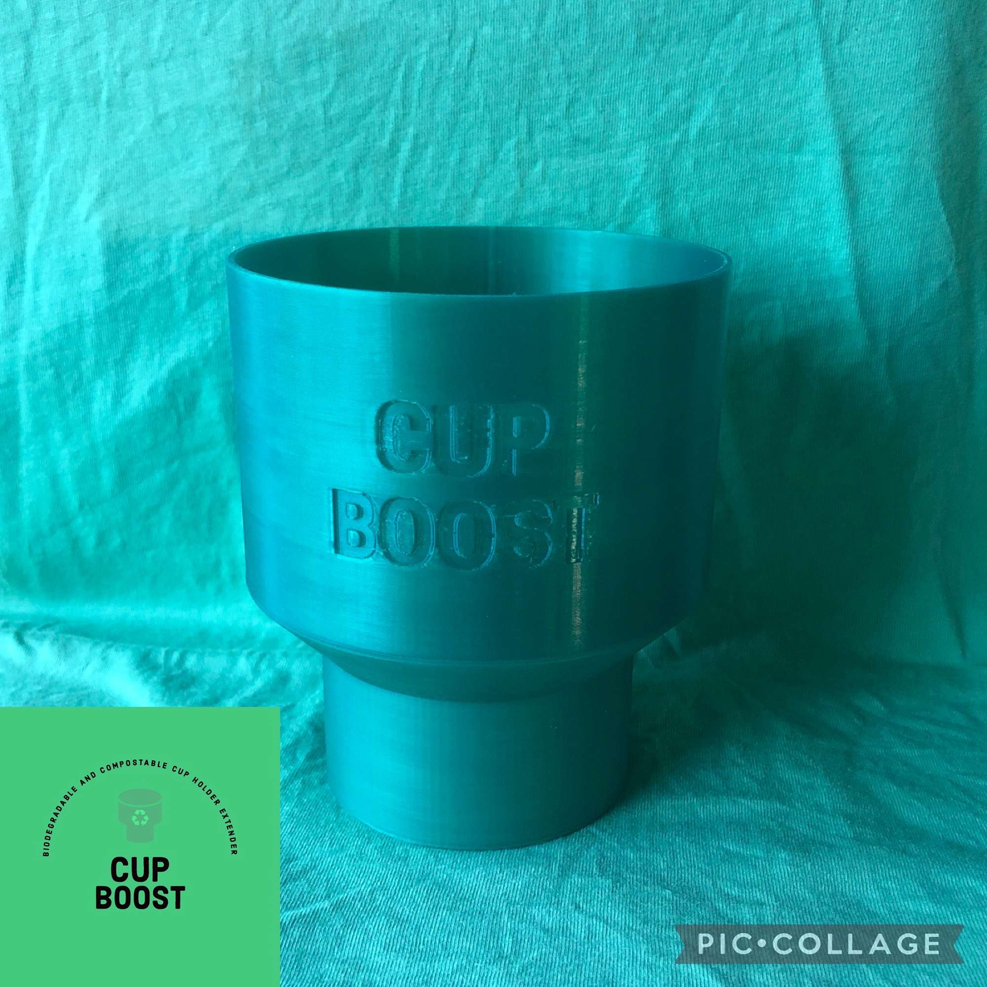 We have created a cup holder extender - the Cup Boost- that fits large drink bottles or containers that don't fit in your car's cup holders. The cup holders are 3D printed and as we are an eco-friendly business most of our cup holders are made out of 100% recycled filament with some colours being made out of biodegradable and compostable filament.