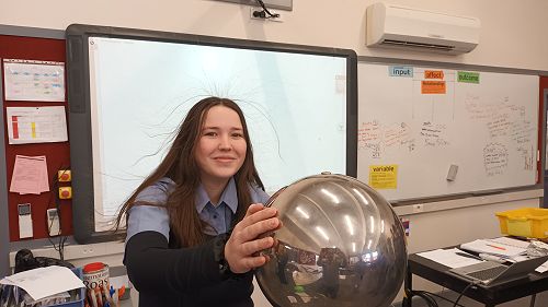 Hair raising experiments in Physics. Anna Roberts demonstrated the effects of too many electrons using the Van der Graaf generator. 🙂 Science, Physics Department — July 27th, 2023 Gallery