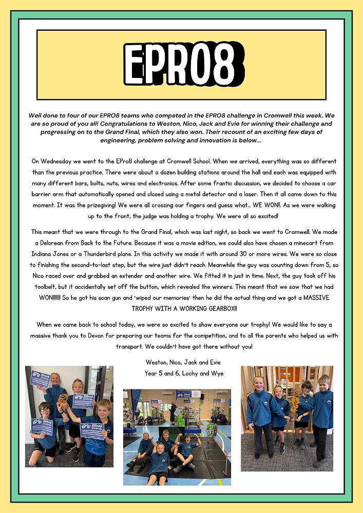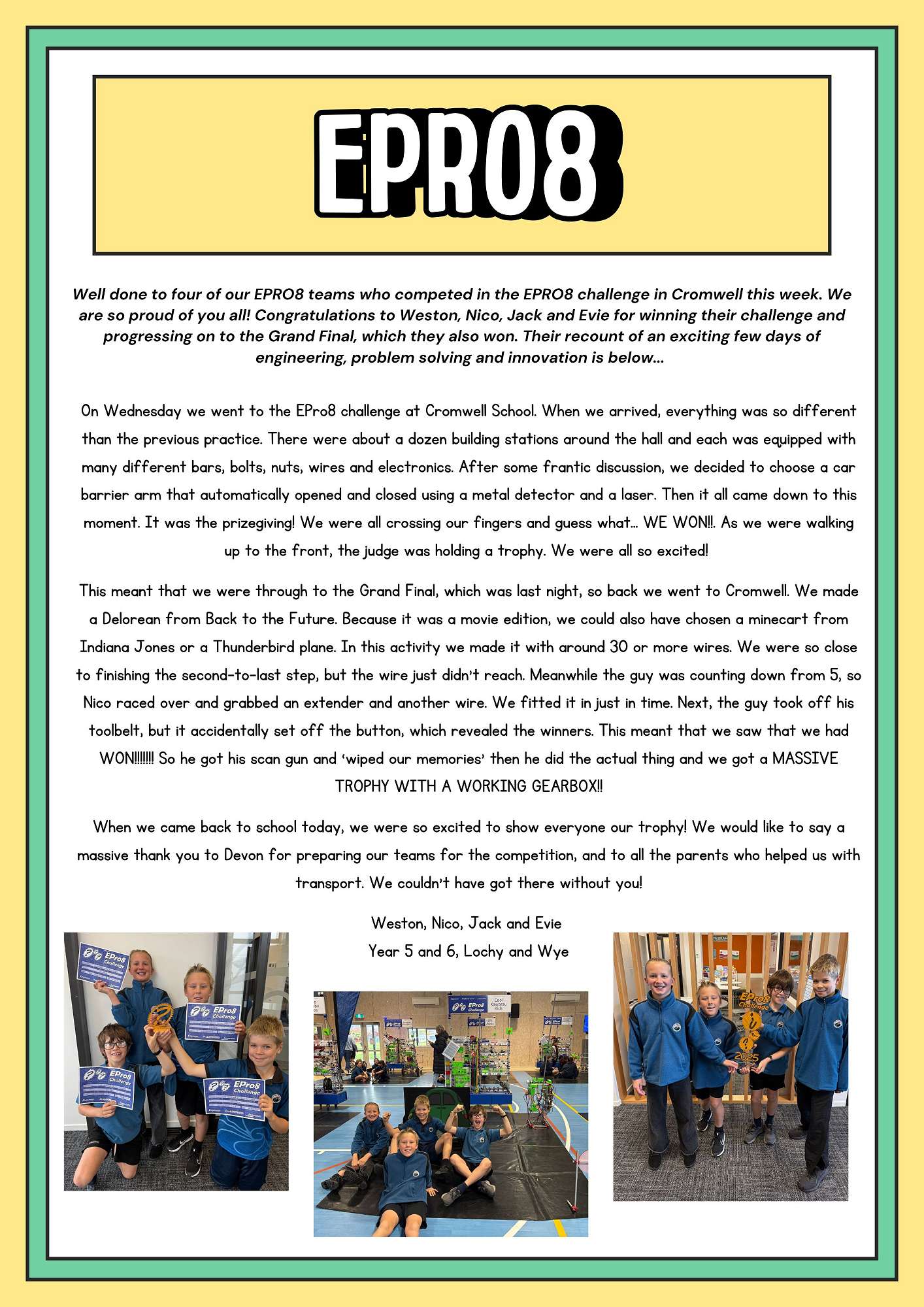 Well done to all four of our EPRO8 teams who competed in the EPRO8 challenge in Cromwell this week. We are so proud of you all!