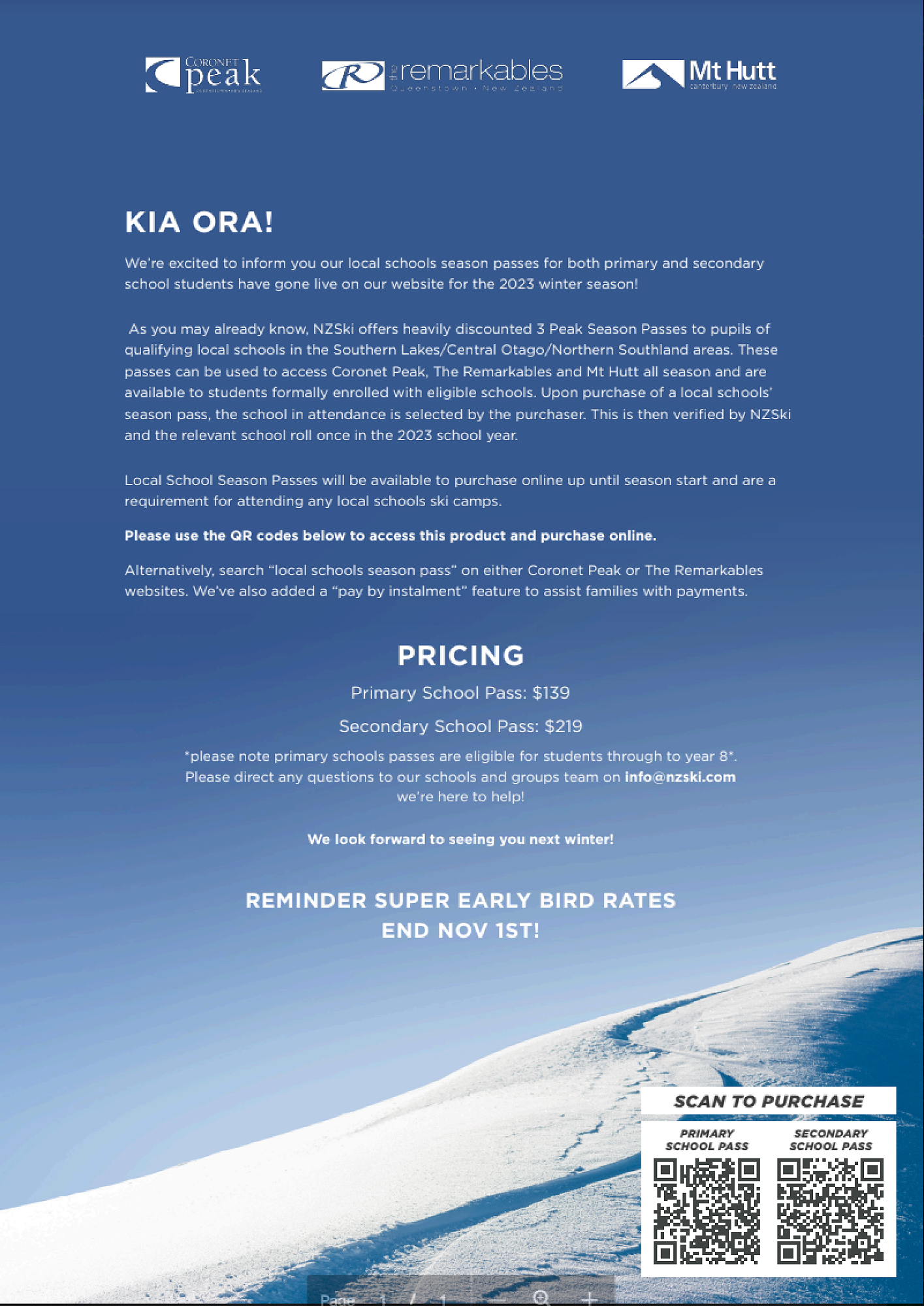 As you may already know, NZSki offers heavily discounted 3 Peak Season Passes to pupils of qualifying local schools in the Southern Lakes/Central Otago/Northern Southland areas. These passes can be used to access Coronet Peak, The Remarkables and Mt Hutt all season and are available to students formally enrolled with eligible schools. Upon purchase of a local schools’ season pass, the school in attendance is selected by the purchaser. This is then verified by NZSki and the relevant school roll once into the 2023 school year.