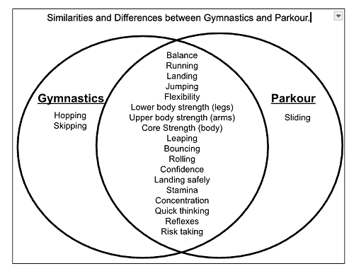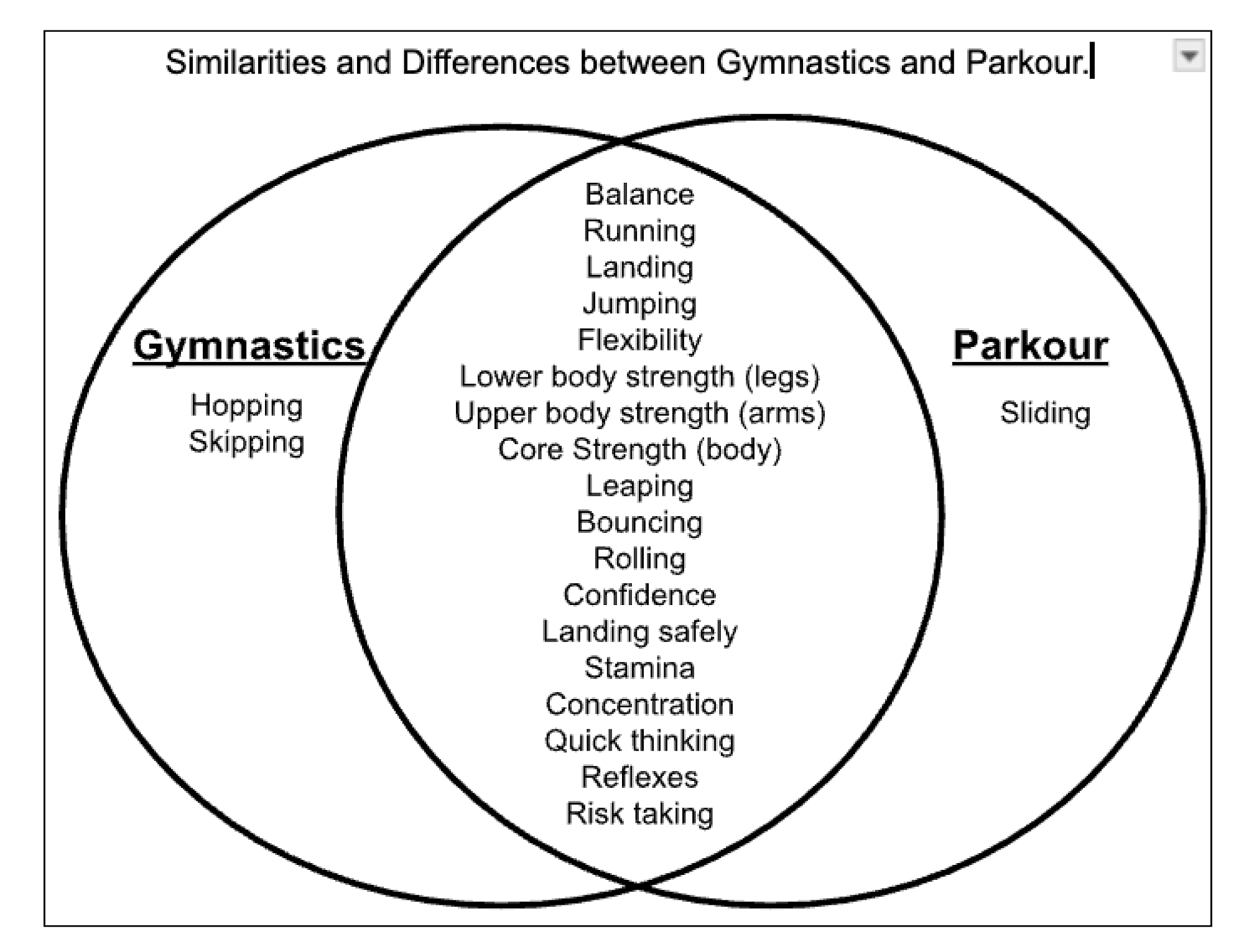 In PE, we were not too excited about Gymnastics, but we love Parkour. Mmmmm? Let's draw a Venn diagram and compare what skills are the same and different for each sport.